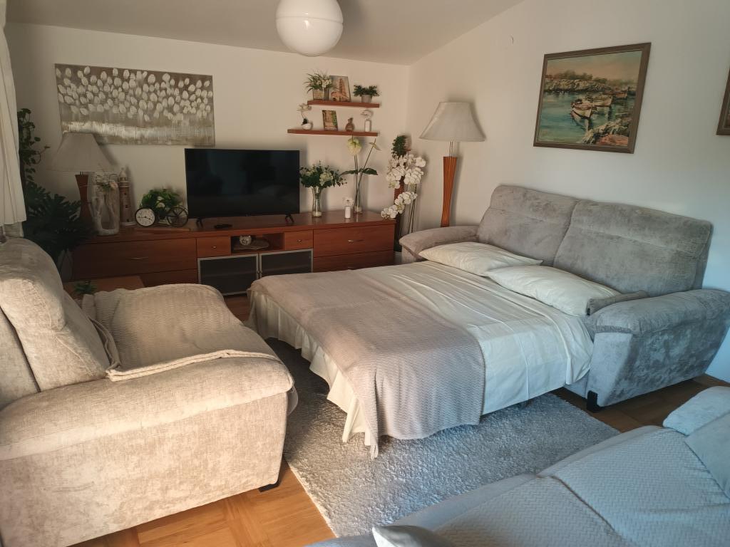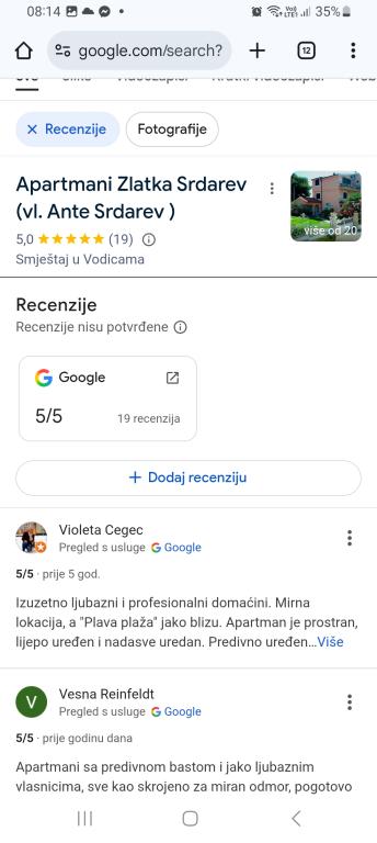Apartments Zlatka Srdarev er beliggende i en rolig del af byen Vodice kendt som Blata; tæt på Punta hotel. Den største strand ligger kun 150 m fra Zlatka-lejligheden, og byens centrum er 300 m væk. Lejlighederne ligger på en privat gade og er omgivet af smuk vegetation og middelhavsplanter som oliventræer, vinranker, figner, kiwier... Vi kan prale af, at vi to gange er blevet belønnet med den bedst anlagte have. Gæsterne kan benytte grillen. Vores lejligheder er helt adskilt fra hinanden, og hver lejlighed har sin egen terrasse. Gæsterne har adgang til parkering i gården. Kom og nyd med os!