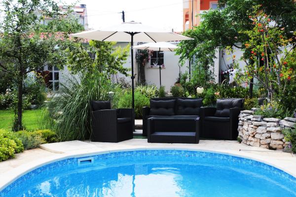 Rustikt indrettet lille villa i en rolig del af byen, nær den gamle bydel, og udelukker brugen af en bil, som du har en parkeringsplads. Villaen er beliggende i et rummeligt og frodig have med en swimmingpool og en børnepool park. Alle nødvendige faciliteter er placeret på en 10-minutters gang fra hotellet.