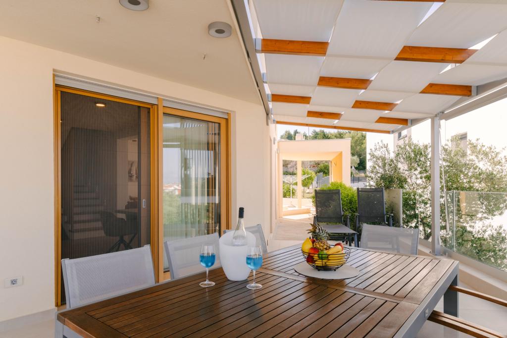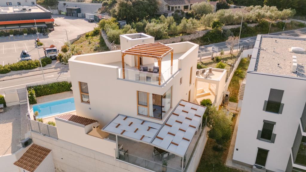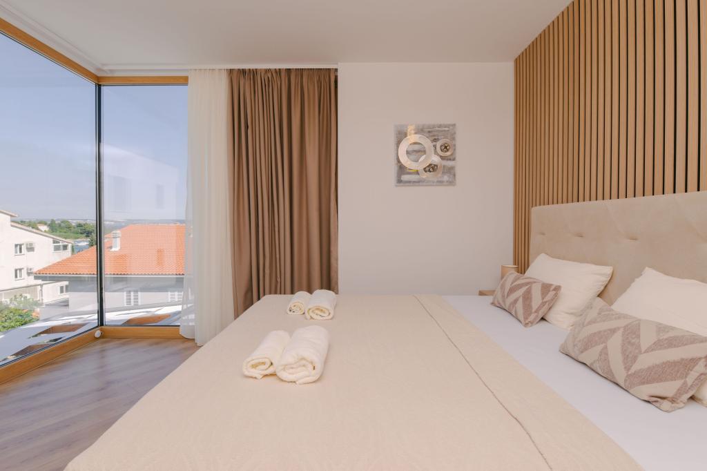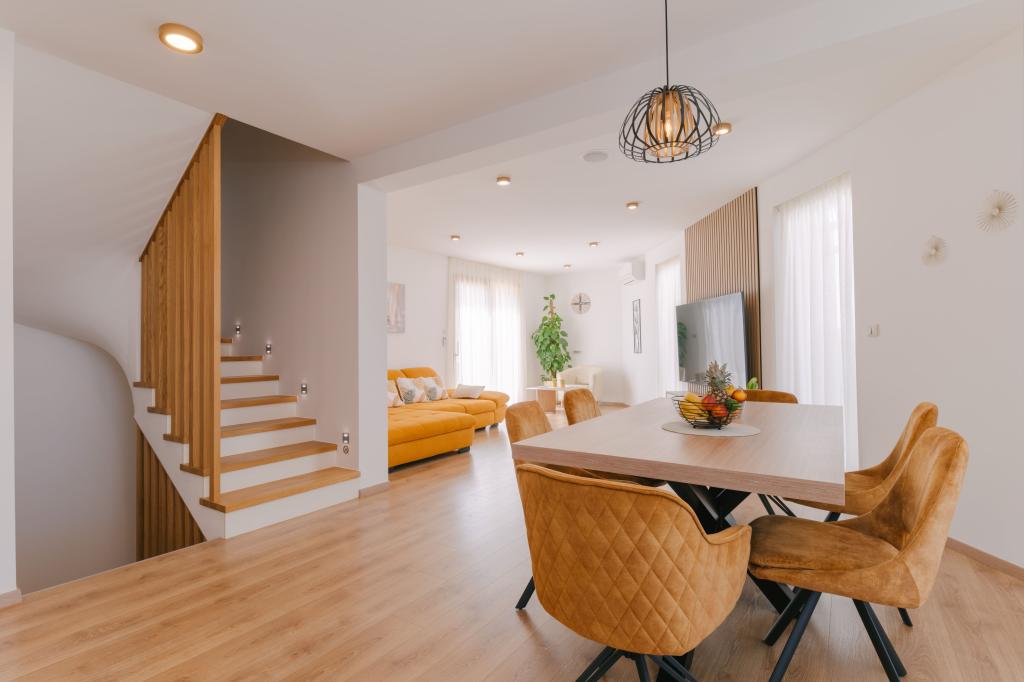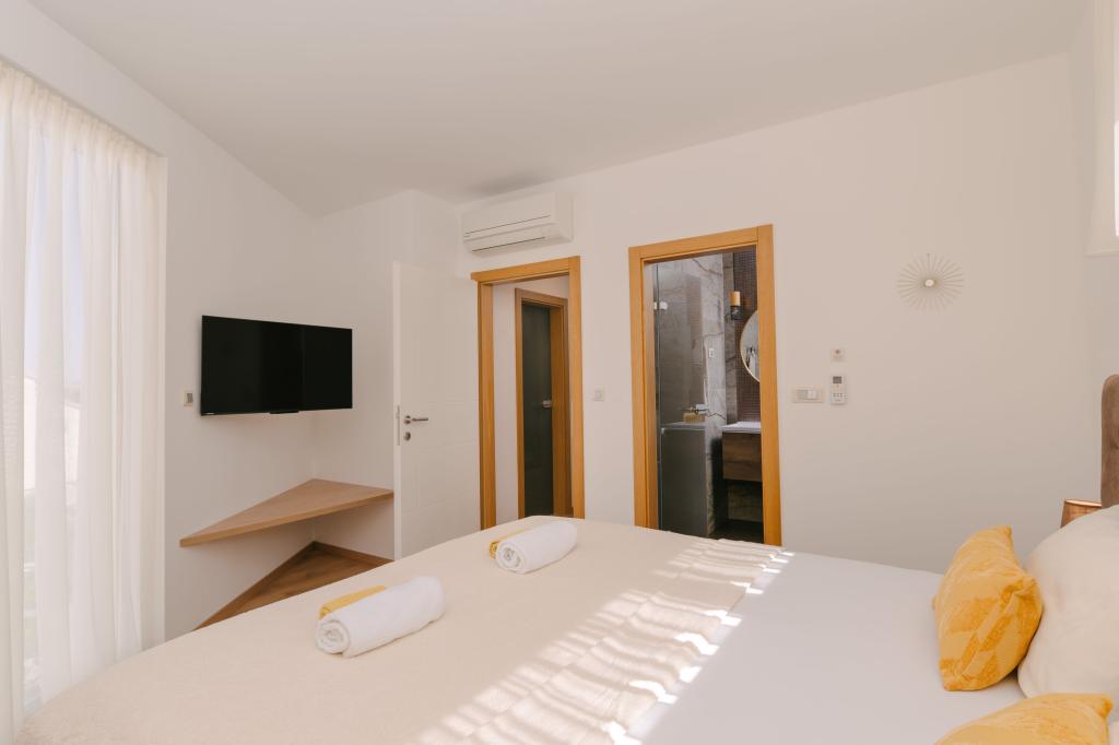 Tre moderne soveværelser er placeret ovenpå, mens et gæsteværelse er placeret i kælderen. Alle badeværelser er udstyret med topmoderne Grohe- og Laufen-armaturer, prestigefyldte designer-keramiske fliser og elegante glasdøre. Huset er officielt kategoriseret af Republikken Kroatiens turistministerium, hvilket giver mulighed for komfortabel indkvartering for 9, endda 10 gæster. Den åbne stue og spisestue, såvel som hvert soveværelse, er udstyret med individuelle klimaanlæg med en stille tilstand, perfekt til en fredelig søvn. Det moderne køkken, fra det berømte østrigske mærke DanKüchen, er fuldt udstyret med topmoderne apparater, herunder et køleskab med ismaskine og en koldtvandsbeholder.