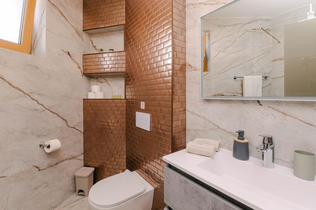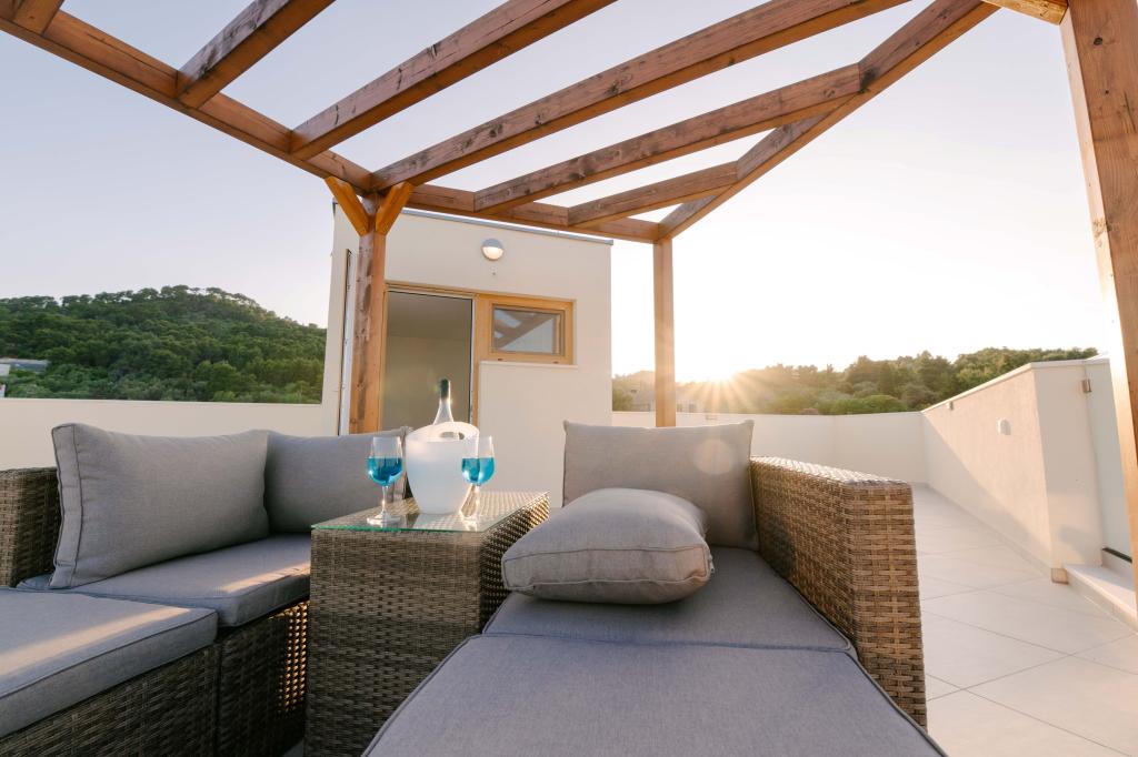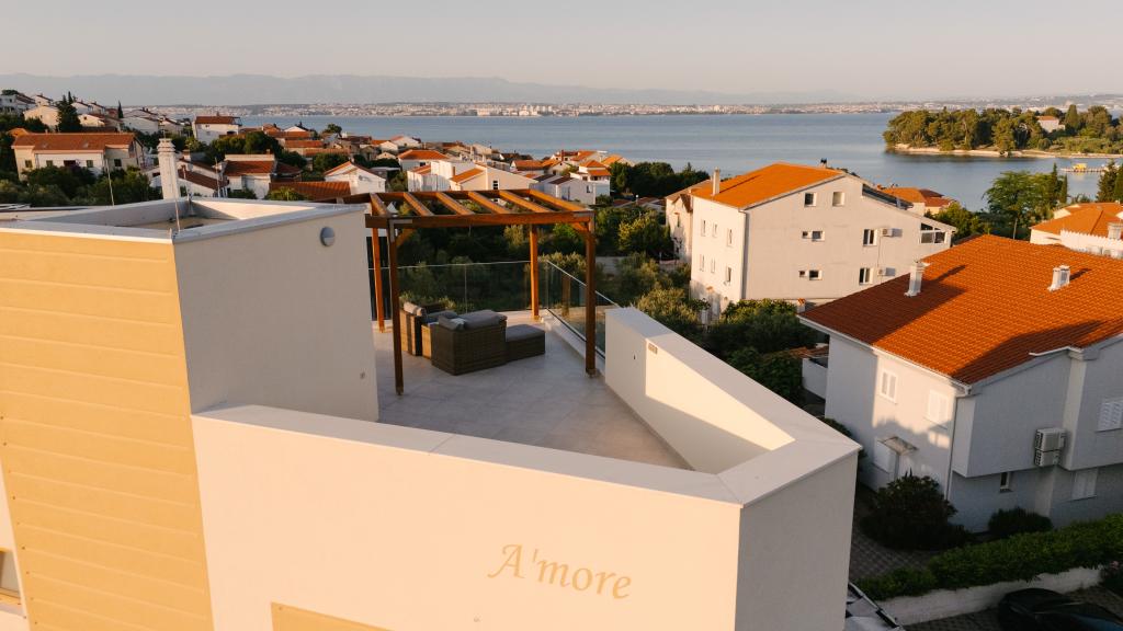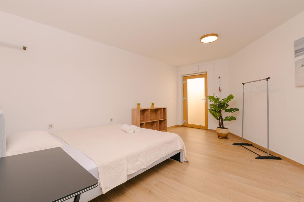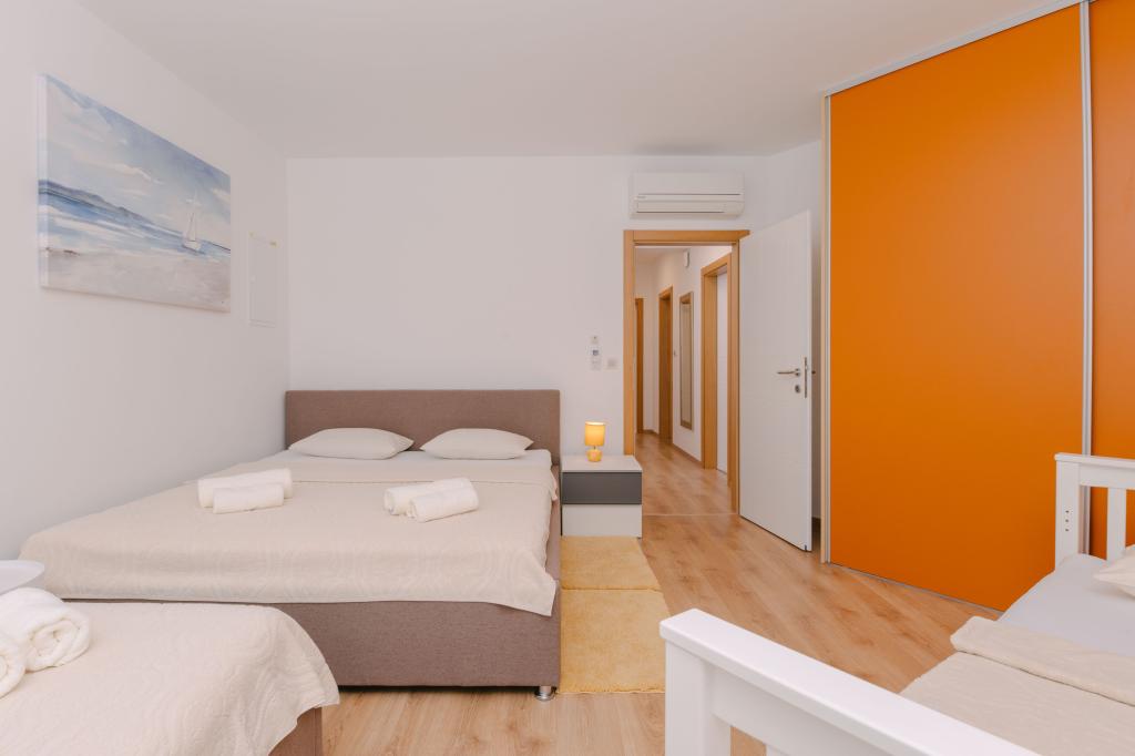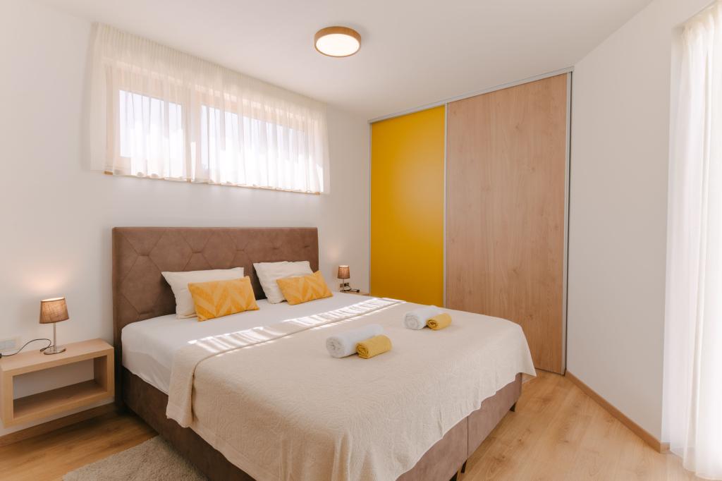 Tre moderne soveværelser er placeret ovenpå, mens et gæsteværelse er placeret i kælderen. Alle badeværelser er udstyret med topmoderne Grohe- og Laufen-armaturer, prestigefyldte designer-keramiske fliser og elegante glasdøre. Huset er officielt kategoriseret af Republikken Kroatiens turistministerium, hvilket giver mulighed for komfortabel indkvartering for 9, endda 10 gæster. Den åbne stue og spisestue, såvel som hvert soveværelse, er udstyret med individuelle klimaanlæg med en stille tilstand, perfekt til en fredelig søvn. Det moderne køkken, fra det berømte østrigske mærke DanKüchen, er fuldt udstyret med topmoderne apparater, herunder et køleskab med ismaskine og en koldtvandsbeholder.
