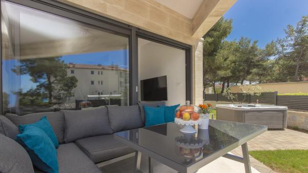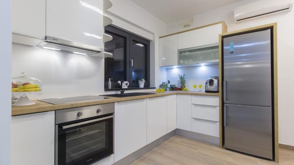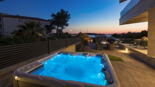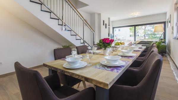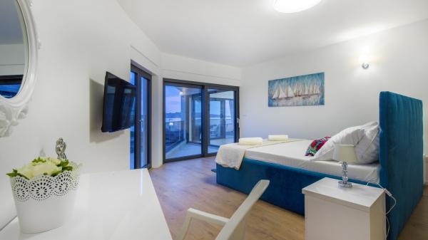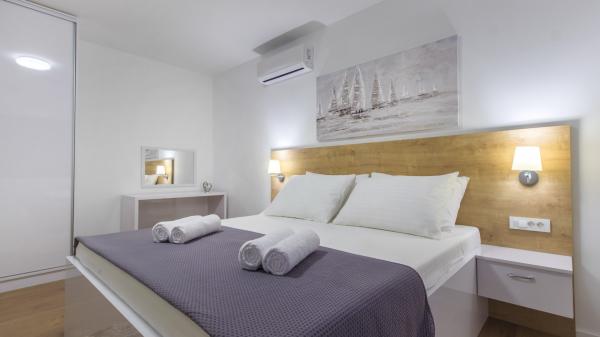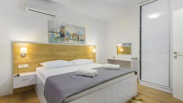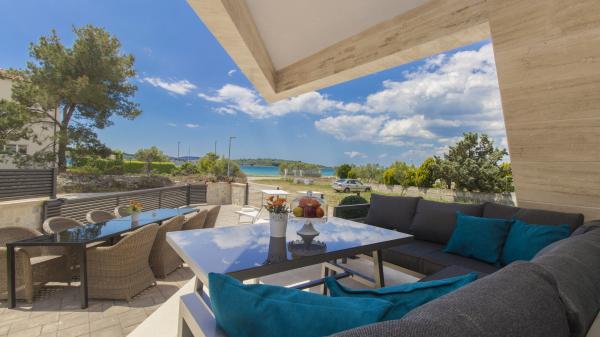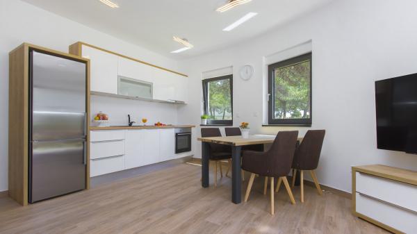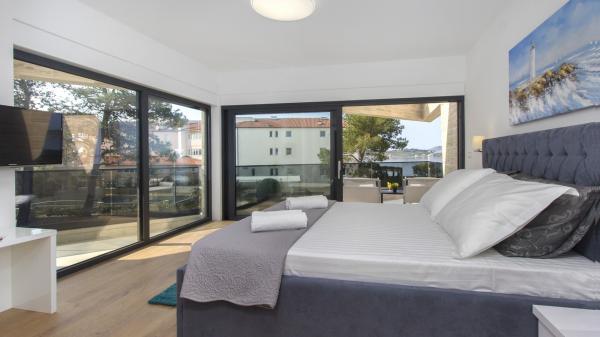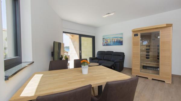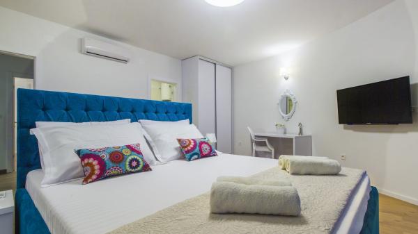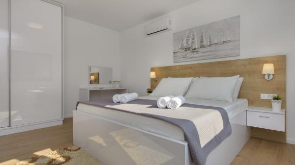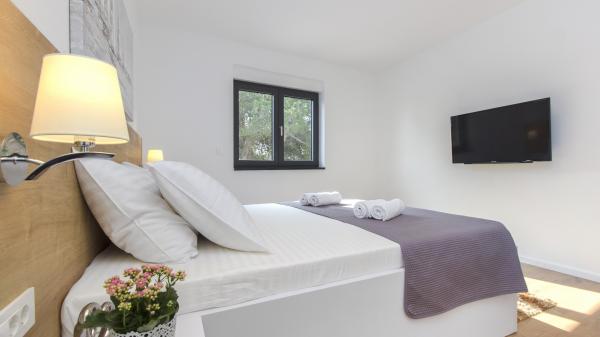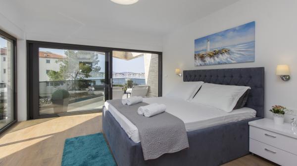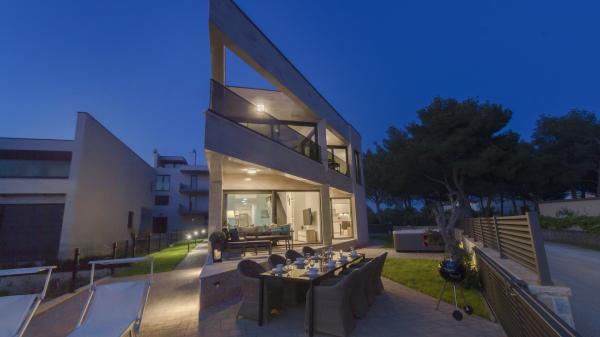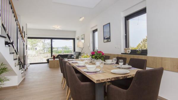 Villa Okit er en nybygget og moderne villa beliggende kun 50m fra sandstranden i Srima, 3km fra Vodice, 13km fra Šibenik. I stueetagen er der et køkken, stue og stue, der udgør en enhed og et separat badeværelse. Fra stuen er der en terrasse og en anlagt gårdhave med havemøbler og et solbadområde. Køkkenet er fuldt udstyret med nødvendige redskaber og tekøkkener til at forberede måltider og drikkevarer. I stueetagen er der også en separat lejlighed med et soveværelse, badeværelse, køkken og spisestue hvor du kan gå ud af gården. På 1. sal er der 4 soveværelser og 3 badeværelser. Soveværelse 1, 20m2 med privat badeværelse og udgang til altan, 180X200 seng, TV. Soveværelse 2, 25m2, med privat badeværelse og udgang til altan, 180X200 seng, tv. Soveværelse 3 og Spoke 4 har et fælles badeværelse, hver 15m2 hver, hver har en 180x200 seng, en kommode og et tv. Indhegnet gård med solbadning og havemøbler, parkeringsplads.
